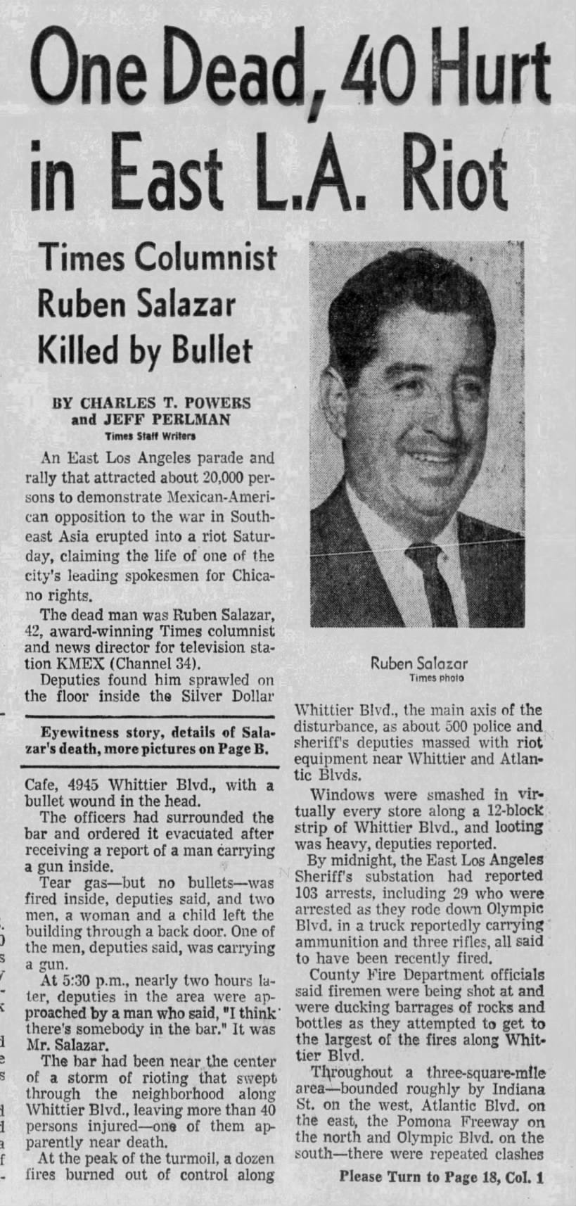 Durante la cobertura, Rubén Salazar, reconocido periodista de origen mexicano, murió tras ser alcanzado por el impacto de un canister de gas lacrimógeno disparado por un oficial del Departamento de Policía de Los Ángeles mientras se refugiaba en el Silver Dollar Café, ubicado en Whittier Boulevard. Por cierto que en mi investigación para el libro descubrí que la primera edición del prestigioso periódico Los Angeles Times del 30 de noviembre la portada decía que Salazar había muerto por una herida de bala.
